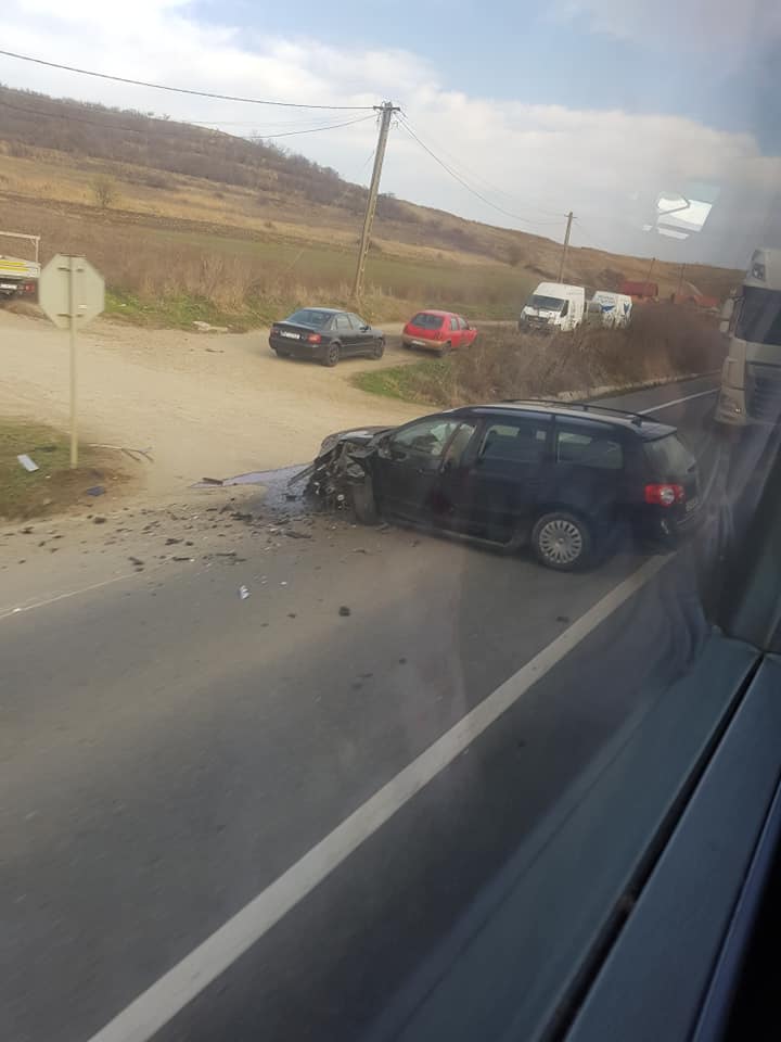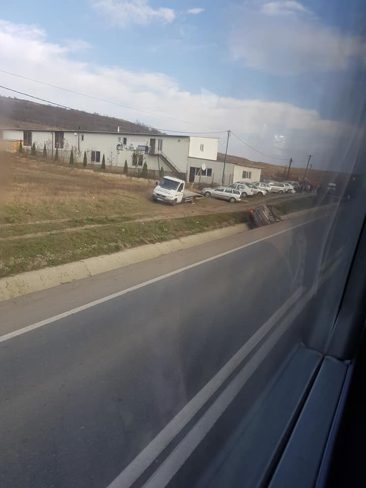 Accidentul pare destul de grav, o mașina este răsturnată în șanț, cealaltă are spartă toata fața.