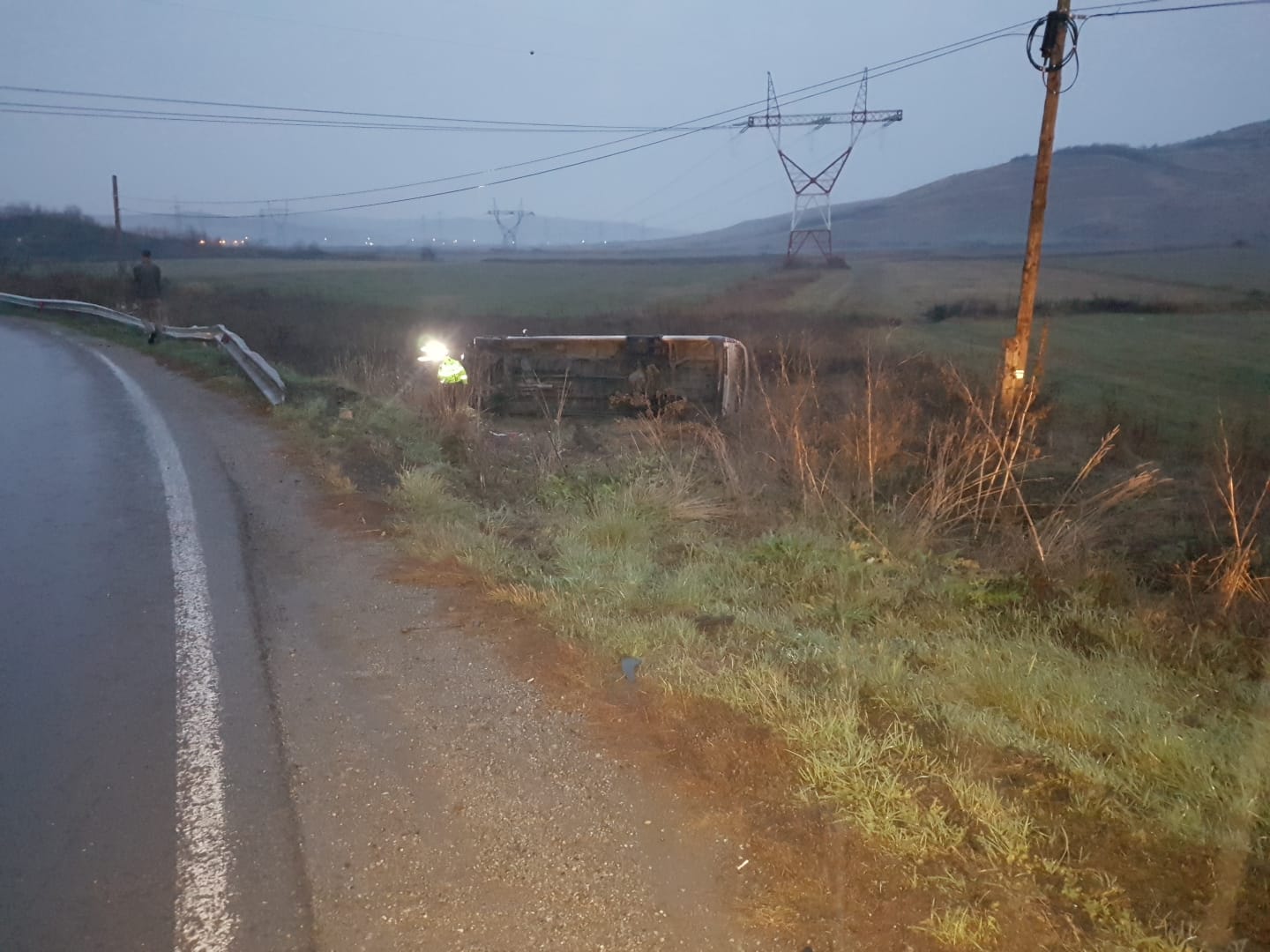 Microbuz răsturnat la Căianu. În această dimineață, un barbat de 33 de ani din localitatea Bărboși județul Mureș, a condus o autoutilitara pe DN 16 spre Apahida și nu a adaptat viteza la condițiile de drum, într-o curbă deosebit de periculoasa la stânga și carosabil ud, a pierdut controlul microbuzului, a părăsit partea carosabilă dupa care s-a rasturnat pe terenul viran aferent sensului de mers.