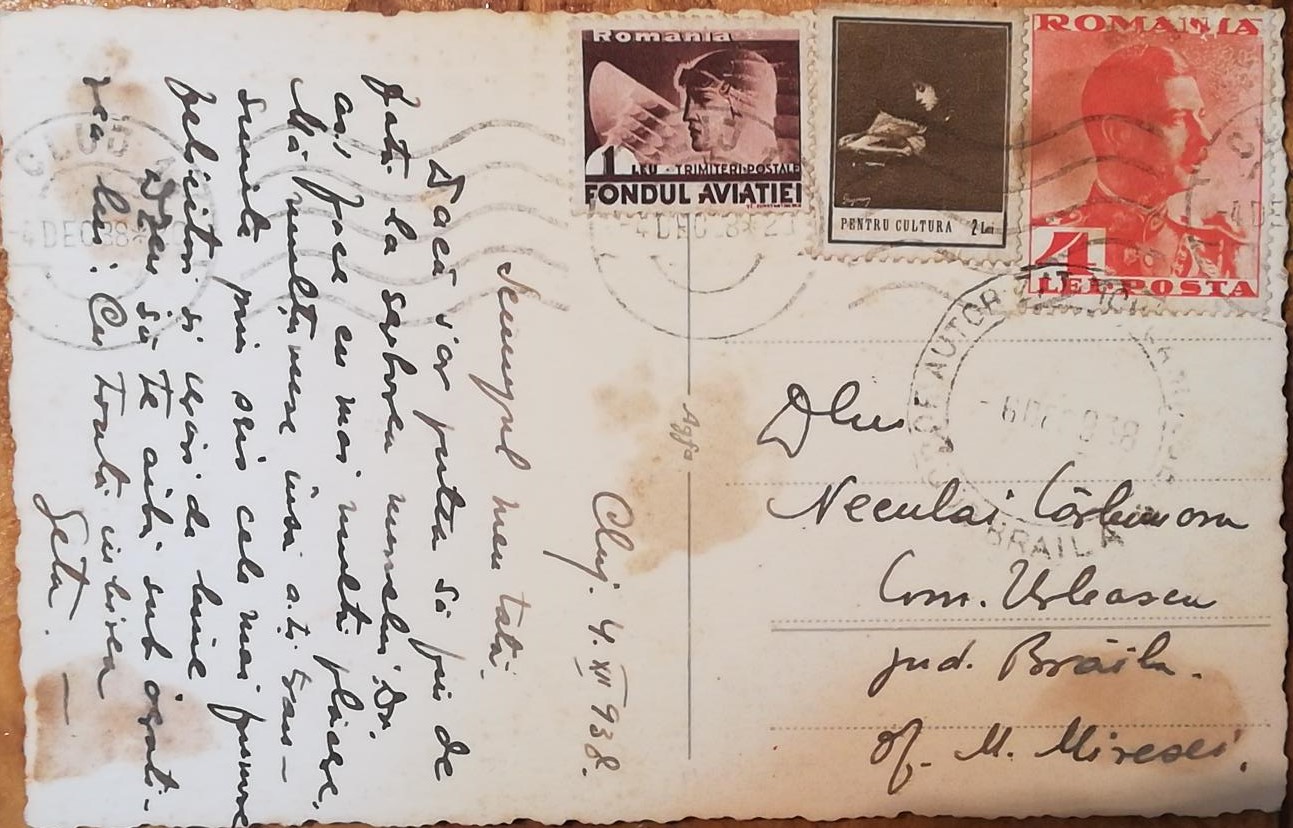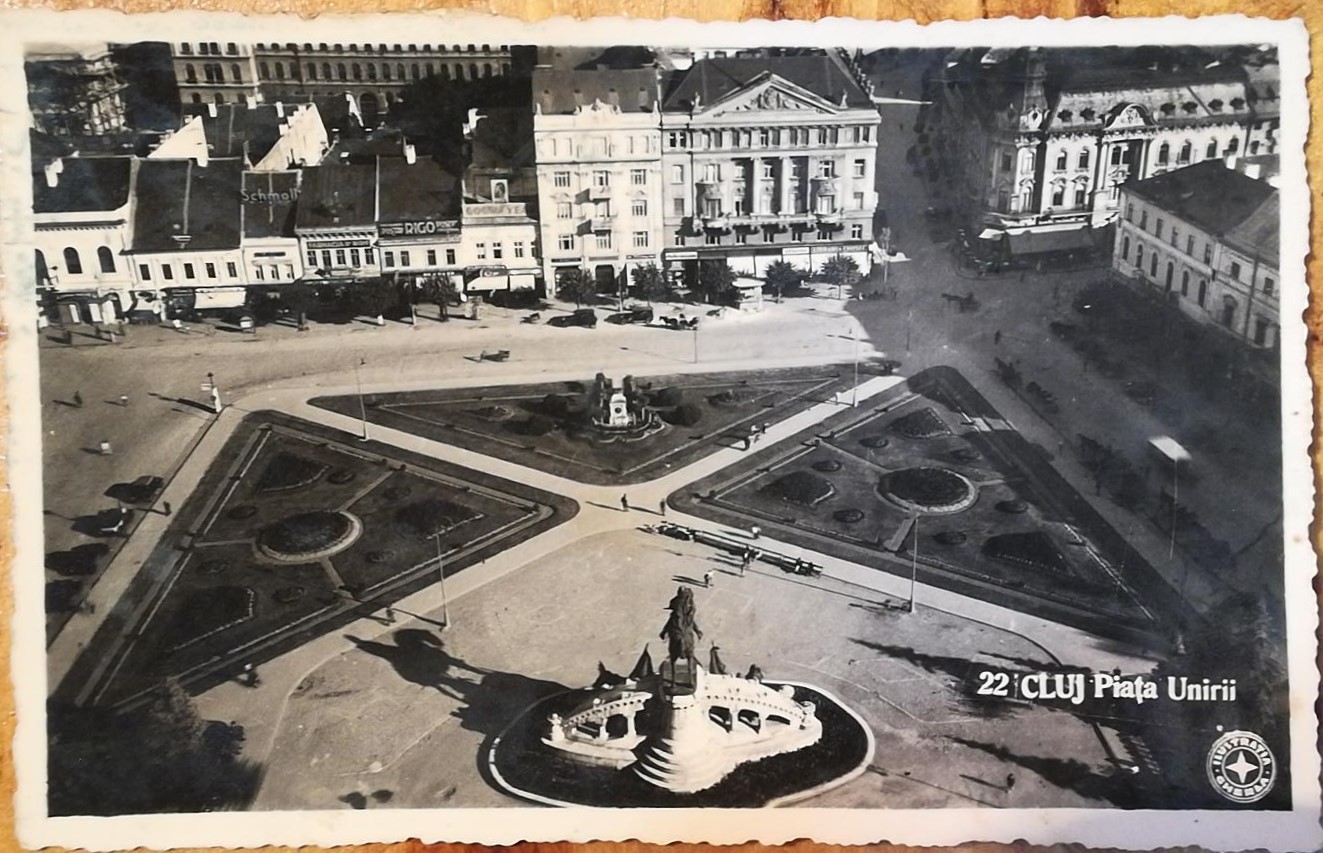 O imagine cu Piaţa Unirii din Cluj-Napoca într-o carte poştală expediată în 1938 (arhiva portalcj.ro).
